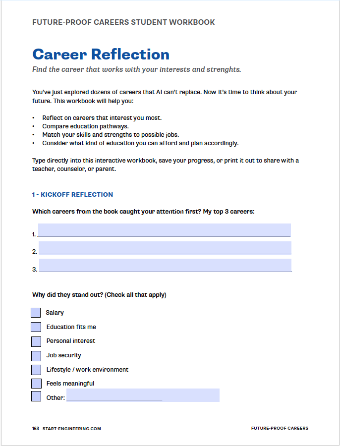 At the end, a 5-page Student Workbook provides activities, reflection prompts, and planning tools to help students identify the careers that fit them best — and map out their next steps.